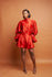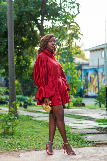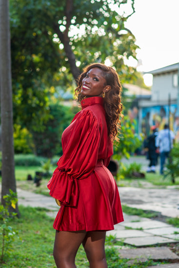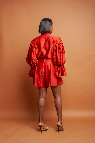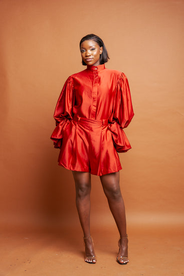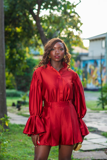 Meet The Ayo Set — where timeless elegance meets bold femininity. Crafted from lustrous crimson satin, this striking two-piece set features tailored high-waist shorts and a dramatic blouse designed to make an unforgettable entrance. The blouse’s voluminous bishop sleeves with flared cuffs and mandarin collar offer a regal silhouette, while the structured shorts create a balanced, flattering fit.