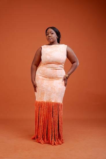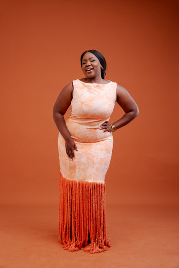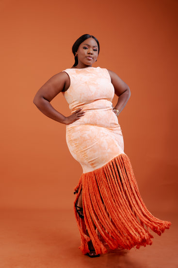 The Chenza Dress is a celebration of freedom and artistry. Crafted from hand-dyed cotton linen fabric in warm sunset tones, each piece carries a unique pattern that makes it one of a kind. Designed with a sleek, tailored silhouette and finished with a bold, floor-sweeping fringe hemline, the Chenza brings effortless drama and fluidity to every step.
