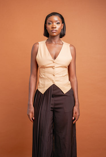 Elevate your everyday look with our tailored sleeveless half coat – a modern twist on classic suiting. Crafted from premium fabric for a sleek, structured finish, this piece features a deep V-neckline, front button closure, and a sculpted waist that flatters the feminine form. The sharp hemline adds edge, making it perfect for both workwear and chic off-duty styling.