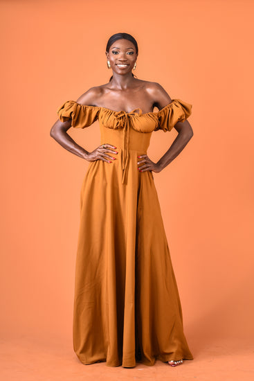 The Nungwi Dress is a sunshine-soaked statement piece designed to flatter and turn heads. Crafted with a structured corseted bodice for a cinched silhouette, it features an off-shoulder neckline, soft ruffle sleeves, and a flowing maxi-length skirt with a daring front slit. Perfect for daytime events, garden weddings, or a dreamy vacation moment.