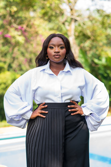 Classic long sleeved blouse crafted from poly cotton fabric.Features a structured collared neckline with a slightly open front that adds a modern elegant touch.The sleeves are full-length with a relaxed fit and finished off with wide cuffs that create a sophisticated silhouette.