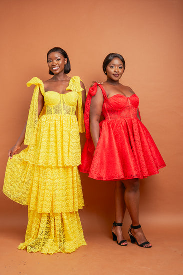 A celebration of softness and strength, the Ruby Dress is crafted in rich red lace with cascading layers and dramatic shoulder ties. The corset-style bodice flatters the form, while the tiered skirt adds volume and movement—striking the perfect balance between structure and grace.