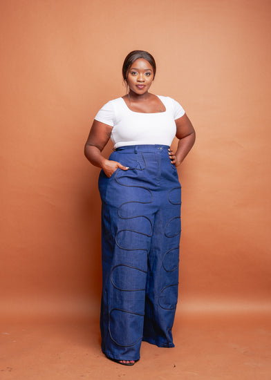 Step into sculptural denim with The Sama Pants — a daring blend of form, comfort, and statement design. Crafted from rich indigo denim, these wide-leg pants feature raised wave-like topstitching that adds texture and movement to every stride. With a high-waist cut that flatters every silhouette, The Sama Pants are built to celebrate curves and command presence.