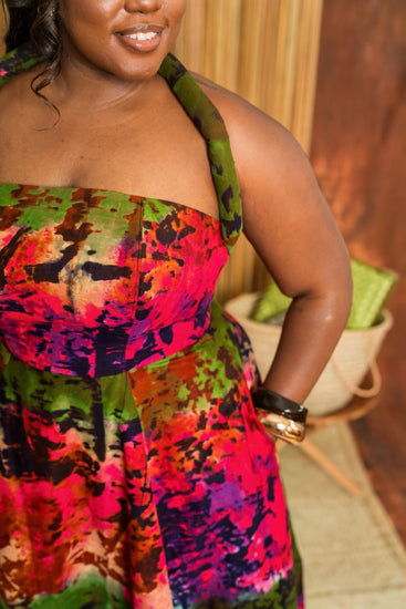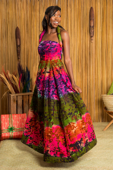 The Rangile maxi dress is crafted from vibrant Ankara tie-dye fabric, designed to bring bold colour and artistic energy to your wardrobe. Featuring a flattering halter-neck cut ,bustier bodice and structure A-line silhouette, this piece sculpts the waist beautifully while adding elegant movement. Produced in limited quantities. Perfect for the woman who loves expressive, standout fashion with a refined finish.
